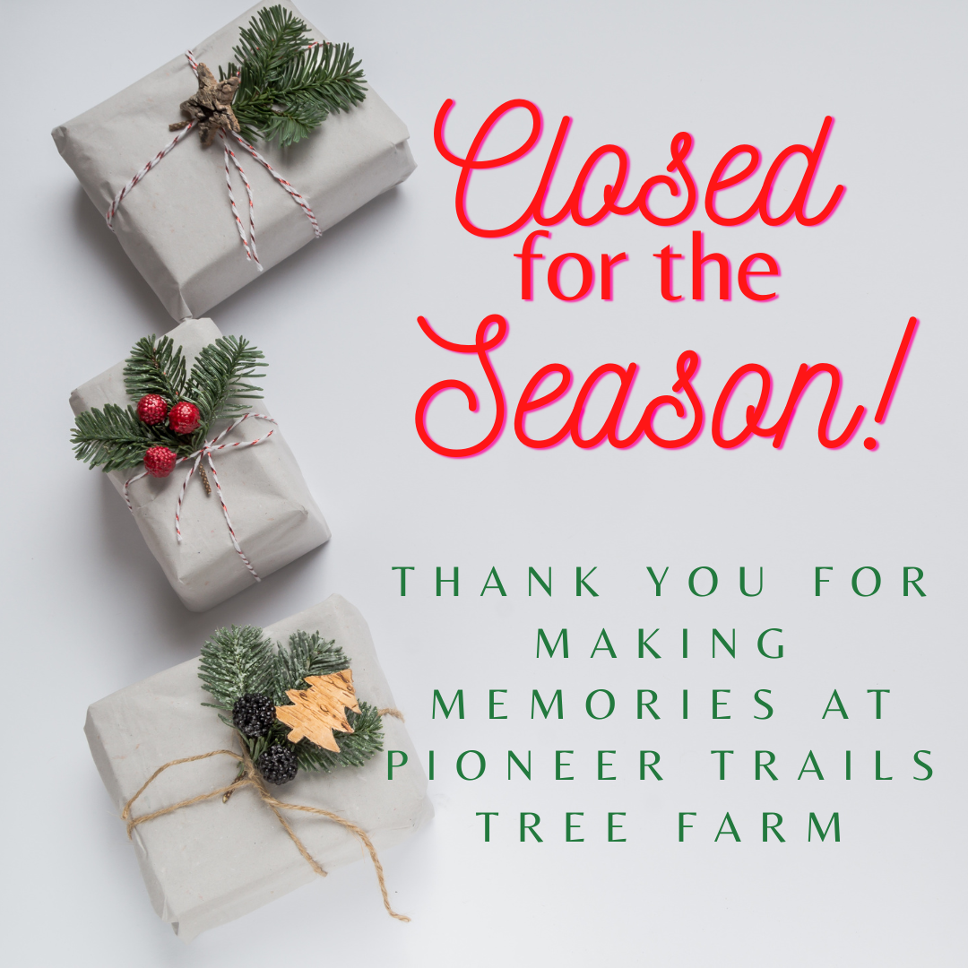 We are closed for the 2025 season! Thank you for making memories with us at Pioneer Trails Tree Farm. We're so grateful you chose to spend part of your Christmas season with us. Wishing you and your family a joyful holiday season. We can't wait to see you next year!
