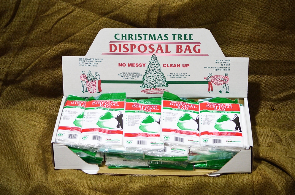 Our Christmas tree removal bags are a convenient and clean way to dispose of your tree after the holiday season. This removal bag placed under the tree stand will help protect floors or carpet and reduce the mess of tree removal. The regular sized tree bags are 90" by 144". The jumbo-sized tree bags are 114" by 144". Both tree bags are 0.7 mil. in thickness and tear resistant.