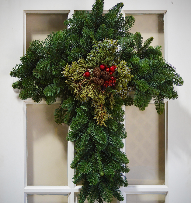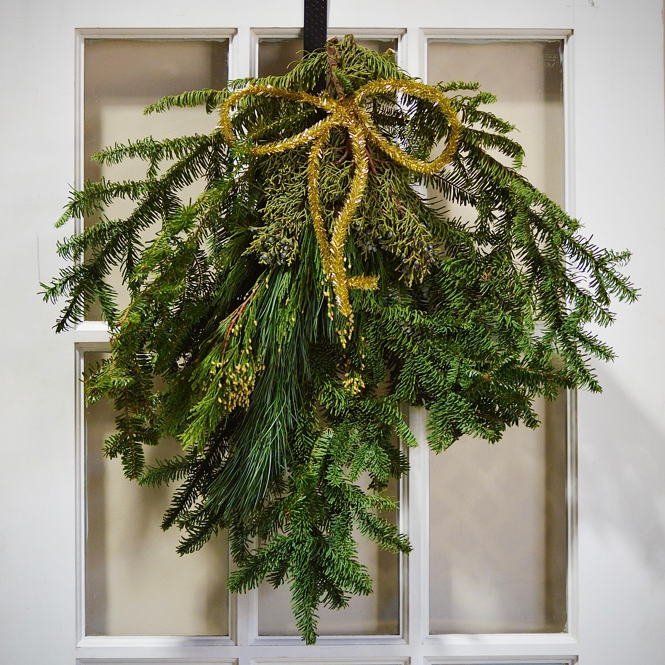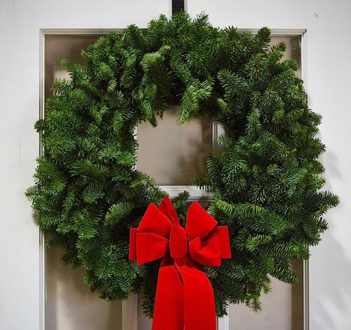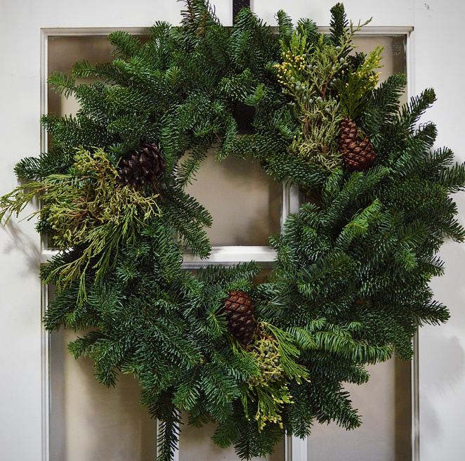 If you are looking for a classic wreath, look no further! Our handcrafted wreaths are a full, single-faced wreaths overflowing with a mix of lush evergreen boughs. They are decorated with clusters of real pinecones and are available in a variety of sizes ranging from 24-34 inches in width. Our wreaths will provide that perfect touch to your Christmas decorating, and don’t forget to pick up a handmade bow in our Gift Shop to customize your wreath.