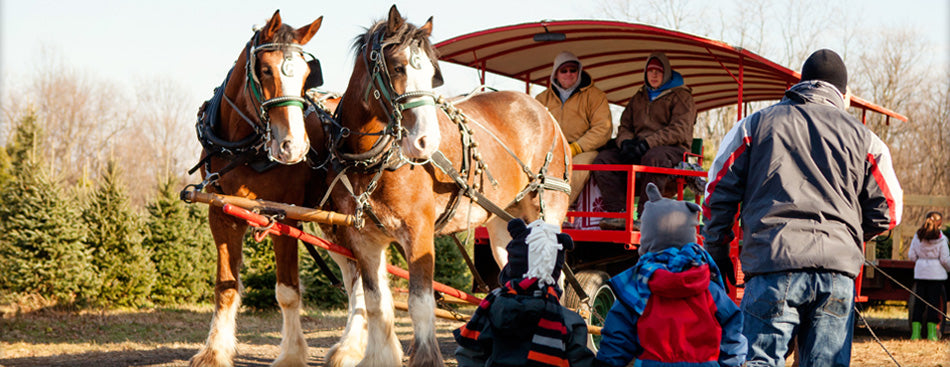 Pioneer Trails Tree Farm offers horse-drawn wagon rides beginning the Friday after Thanksgiving. Horse-drawn wagon rides are available November 29th, 30th and December 1st, 7th, 8th. Horse-drawn wagon rides are available from 10am - 4pm. Pictures with the horses are a must-have! There is no fee or appointment necessary - just bring your camera! Tractor-drawn wagon rides are available daily during the entire season.
