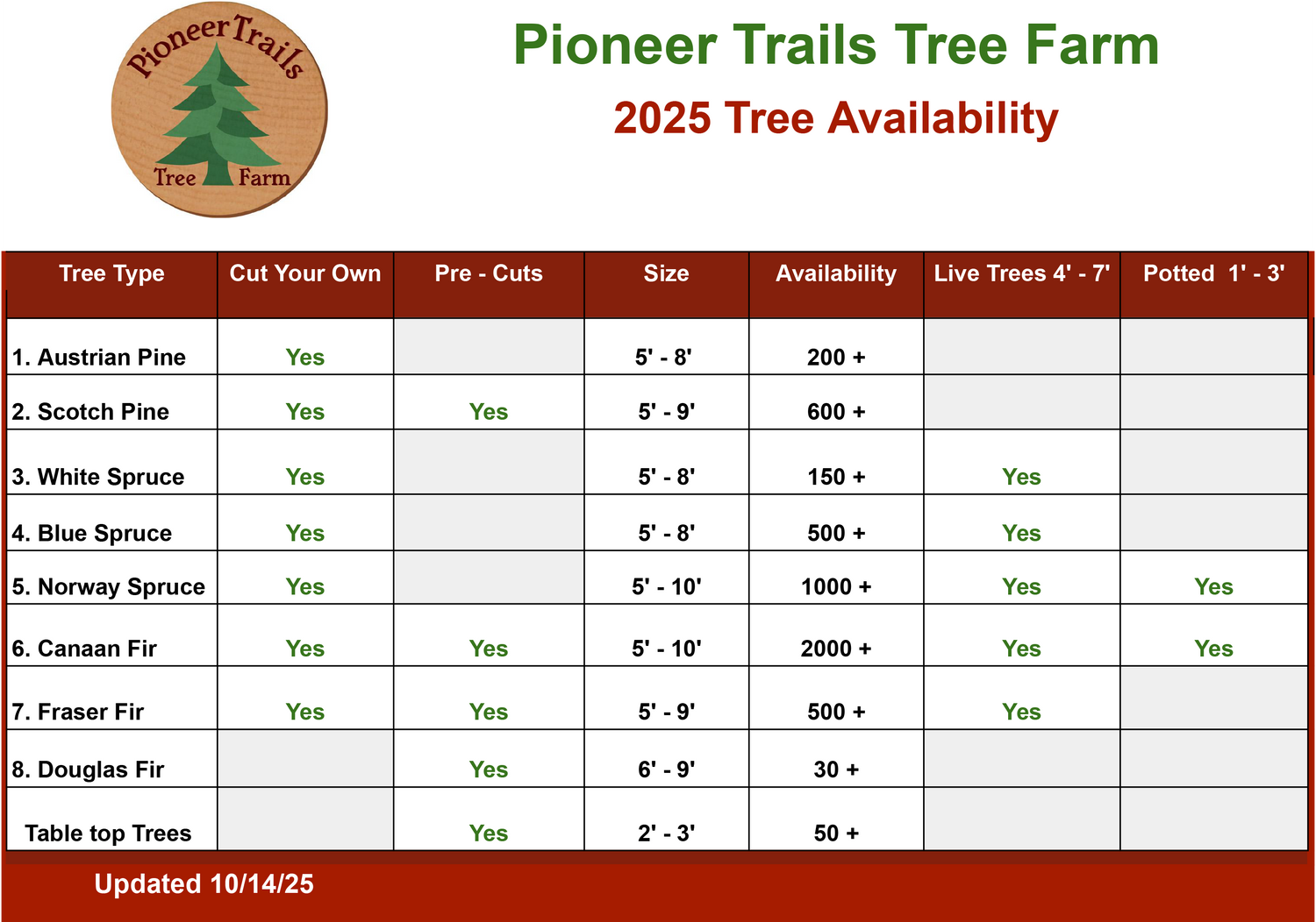 Pioneer Trails Tree Farm offers a variety of landscaping trees. Our spring and fall inventory normally includes Colorado Blue Spruce, Norway Spruce, and White Spruce. We also offer Arborvitae varieties, including Dark Green, Emerald Green, and Techny varieties. We invite you to visit our farm and view our trees. Customers are welcome to call ahead for tree sizes and availability.